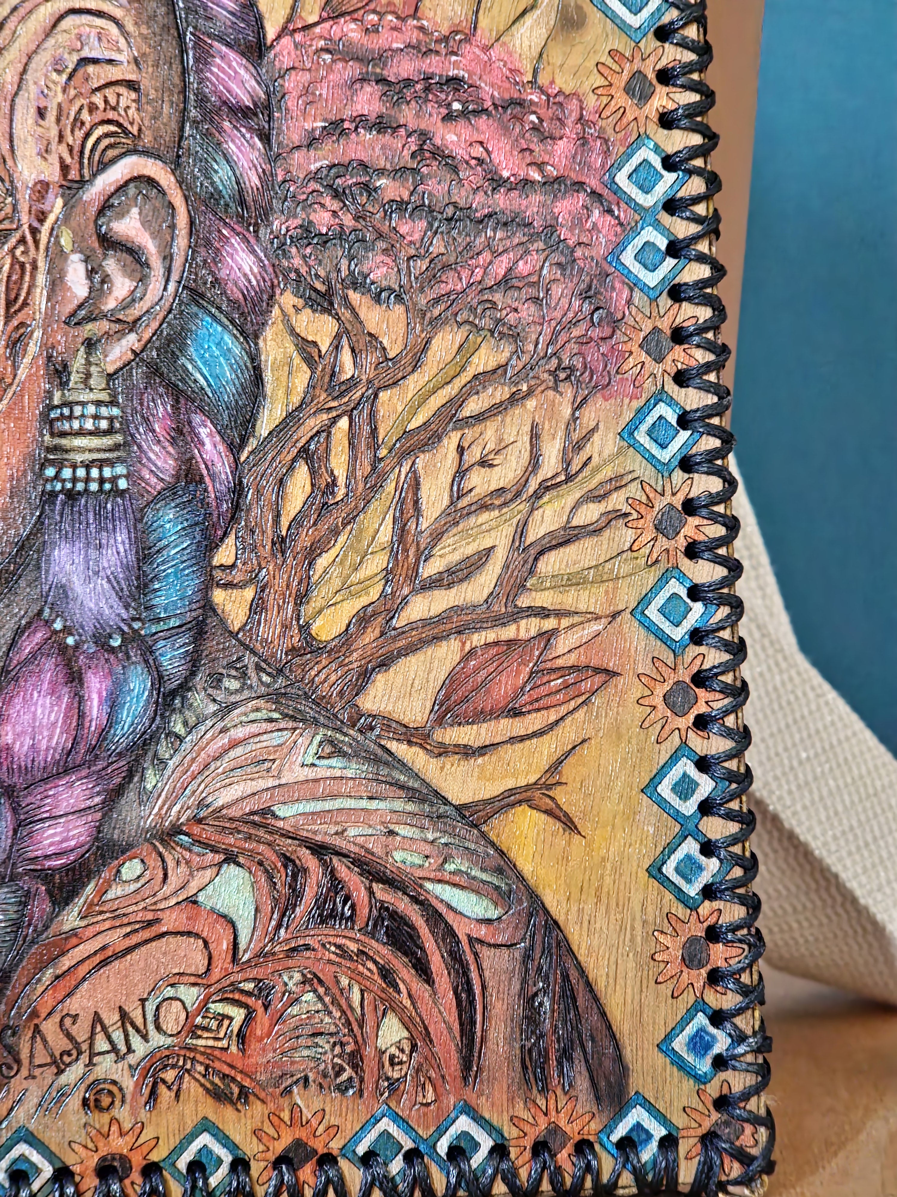 Bois recyclé pyrogravé et peint entièrement à la main